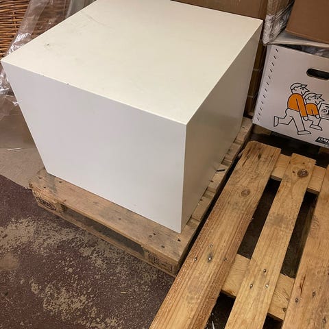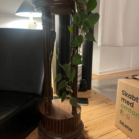 Fint podie i sortmalet ege finér. Det er solidt og kan holde til tunge ting. Det har engang stået i en butik og har derfor en lille nedfræset firkant på toppen hvor butikkens logo har siddet.