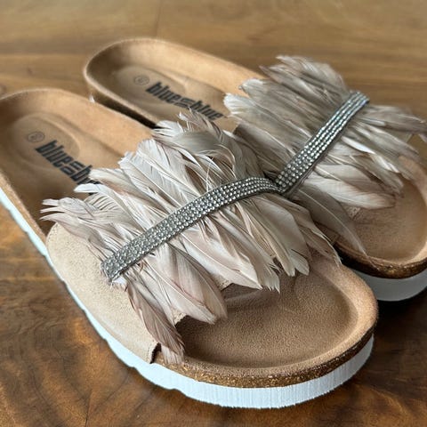Blue on Blue sandal med fjer og sten