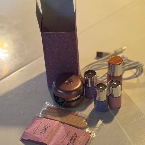 Le mini macaron gelneglelak sæt med LED-lampe. Sættet indeholder flere forskellige farver gelneglelak i små flasker samt en kompakt LED-lampe til hærdning af lakken. Egnet til hjemmebrug til gelmanicure på naturlige negle. Lampen tilsluttes med ledning, som ses på billedet. Farverne spænder fra lyse og neutrale nuancer til mørkere og mere kraftige toner.