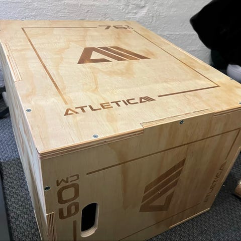 Olive Fitness plyo box til træning. Boksen har 3 højdeindstillinger på henholdsvis 50, 60 og 75 cm, markeret på siderne. Overfladen er sort med farvemarkeringer for de forskellige højder. Velegnet til plyometrisk træning, hop og styrkeøvelser i hjemmet eller i fitnesscenter. Nypris 2795kr
