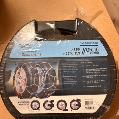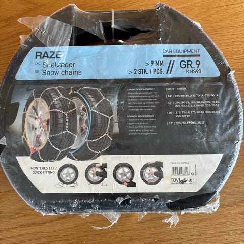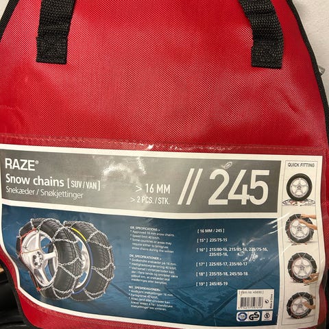 Raze 230 snekæder til SUV og varebil. Kæderne er beregnet til dæk med frigang på over 14 mm. Leveres i en rød transporttaske for nem opbevaring. Velegnet til brug på sne- og isglatte veje, hvor der kræves ekstra vejgreb.
