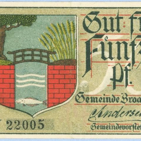 Broager 50 Pf notgeldseddel med motiv af dansk flag og teksten "Der er et yndigt land" på forsiden. Bagsiden har tysk tekst med pålydende værdi 50 Pfennig, årstallene 1864 og 1919 samt ørnemotiv. Seddelen er trykt i flerfarvet tryk og stammer fra Broager-området (Braacker/Gemeinde Braacker). Velegnet til samlere af historiske pengesedler og notgeld.