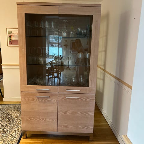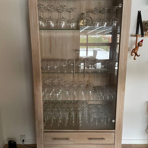 Flot vitrineskab i massivt, sæbebehandlet egetræ. Med glasdøre