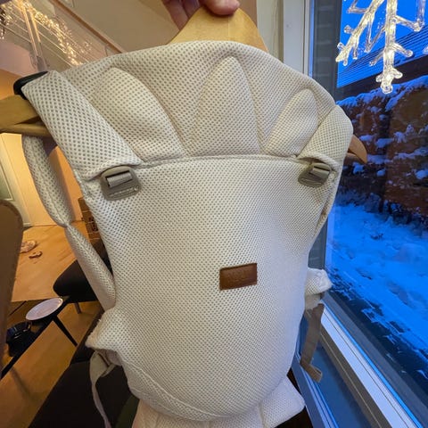 Bæresele i sort og beige med polstrede stropper og bred hofterem. Selen har spænder til justering, så den kan tilpasses bærerens krop. Indersiden er lys/beige, hvilket gør det lettere at se barnet i selen. Egnet til at bære spædbørn og mindre børn tæt på kroppen på mave eller ryg, afhængigt af barnets alder og vægtgrænser angivet på mærkaterne. Tekst og advarsler fremgår på indersiden af hofteremmen.
