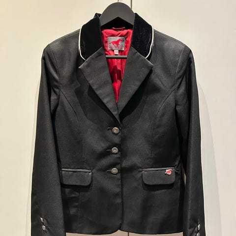 Red Horse blazer jakke i str. 164. Jakken er sort med diskret glimmer og pynt med små nitter langs krave og lommekanter. Modellen har tre knapper foran og to forlommer. Egnet som pæn jakke til ride stævner, fx til større børn eller teenagere i ca. str. 164.
