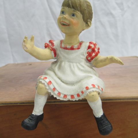 Figur af bedsteforældre med barn som figur i flere farver. Motivet viser en bedstefar og bedstemor siddende på en bænk med et barn på skødet. Bedstemoderen bærer lang kjole og sjal, bedstefaren er iført jakkesæt, og barnet har kjole og støvler. Figuren er detaljeret udført med naturtro ansigter og tøjfolder og egner sig som dekoration i stue, på hylde eller i vitrineskab.