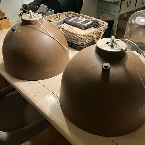 Pendellamper i metal med hvid emaljeret inderside. H: 39 cm. Diameter 41 cm. Lamperne er beregnet til montering i loftet. 5 meter ledning er monteret på hver lampe. Egnet til brug over bord, i køkken, stue eller andre rum.