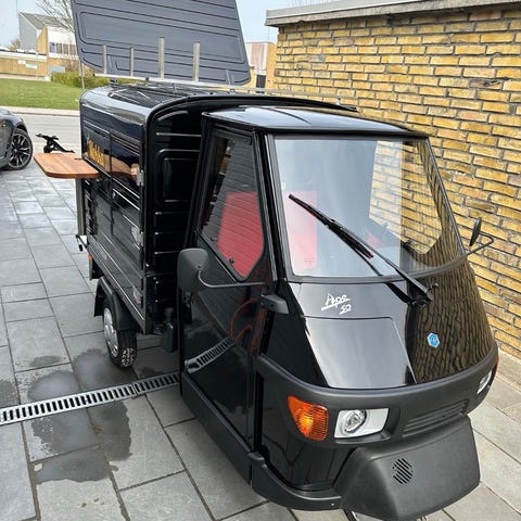 Efter 4 gode år har vi valgt at sige farvel til vores to piaggo ape 50. Vognene er fra henholdsvis 2006 og 2016 og er i god stand. Kaffevognen indholder følgende: