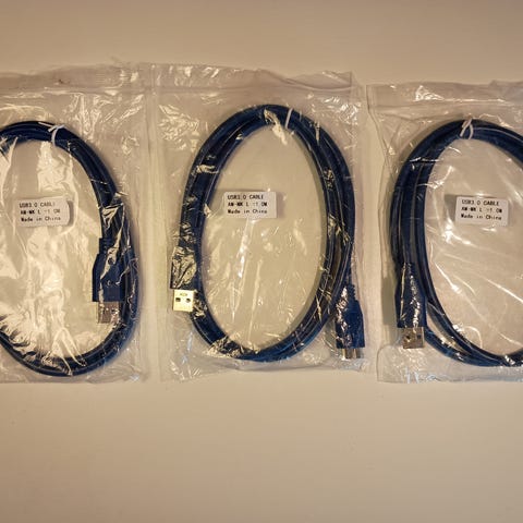USB 3.0 A til USB 3.0 B kabel i sort. Kablet har USB-A hanstik i den ene ende og USB-B 3.0 hanstik i den anden ende, typisk anvendt til tilslutning af eksterne harddiske, printere eller andre enheder til computer. Velegnet til dataoverførsel med USB 3.0-standard. Flere kabler på billederne, længde ikke oplyst.