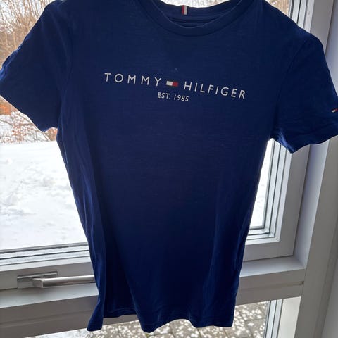 Tommy Hilfiger T-shirt til dreng i størrelse 164. T-shirten er blå og fremstillet i bomuld. Forsiden har et tryk med karakteristiske farveblokke og teksten "Hilfiger". Klassisk kortærmet model.
