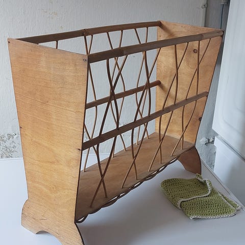 Fin retro avisholder eller magasinholder til at holde styr på blade og aviser. I træ. Muligvis teaktræ. Med 3 rum.
