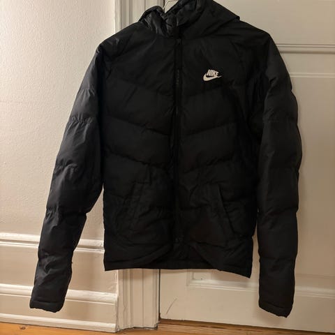 Nike jakke til børn i str. 140 (ca. 132-147 cm). Jakken er sort og fremstillet i polyester. Modellen har hætte, gennemgående lynlås foran og quiltet/puffer-design. Unisex pasform egnet til både drenge og piger.