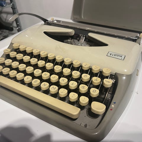 Adler Universal 400 skrivemaskine i grå nuance. Mekanisk bordskrivemaskine med fuldt tastatur og vogn til papirindføring. Egnet til almindelig skriftlig dokumentation, noter eller som kontor- og studieudstyr. Klassisk model, der kan bruges både funktionelt og som dekorativt indslag i indretningen.