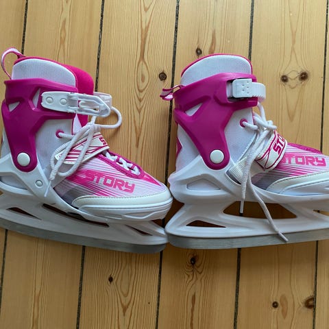 Nijdam justerbare skøjter str 30-33. Skøjterne er i hvid med pink og grå detaljer. Hård yderskal med klikspænder og justeringsknap i siden, som gør det muligt at tilpasse længden indenfor 30-33. Se billeder.