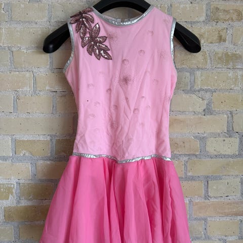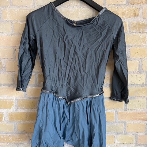 Kunstskøjteløb kjole i sort med lange ærmer. Dragten har mesh-detaljer på ærmer og øverste del af overkroppen samt på ryggen. Foran er der påsyede klare sten i et strålemønster fra halsudskæringen ned over brystet, og der er også sten på kraven. Ryggen har dråbeformet åbning ved nakken. Nederst er der kort skørt i samme stof som dragten. Egnet til kunstskøjteløb eller anden skøjtesport.
