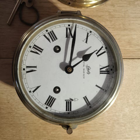 Antikt SKIBSUR som skal optrækkes en gang om ugen og som "slår GLAS", dvs. 1-8 slag hver halve time, som holder styr på hvor lang en vagt er på et skib, nemlig 4 timer eller 8 halve timer. Dette vil sømænd kunne fortælle mere om.