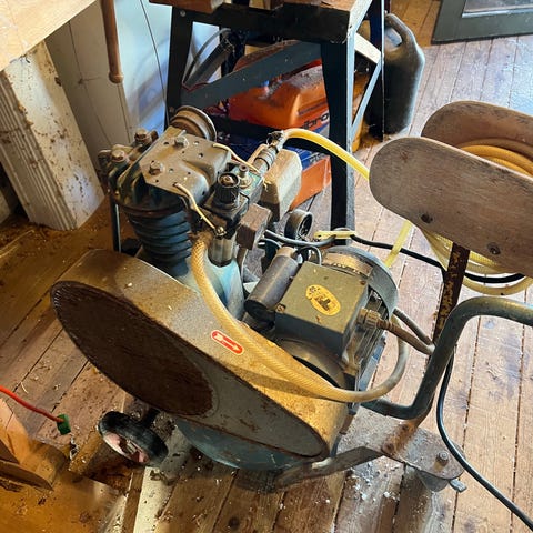 Polaris MK235 kompressor. Mobil kompressor med liggende tryktank og bærestativ med hjul. Udstyret med manometre til aflæsning af tryk samt tilslutning til luftslange. Egnet til trykluftopgaver som f.eks. oppumpning og brug af luftværktøj, afhængigt af kompressorens specifikationer og tilbehør.