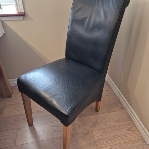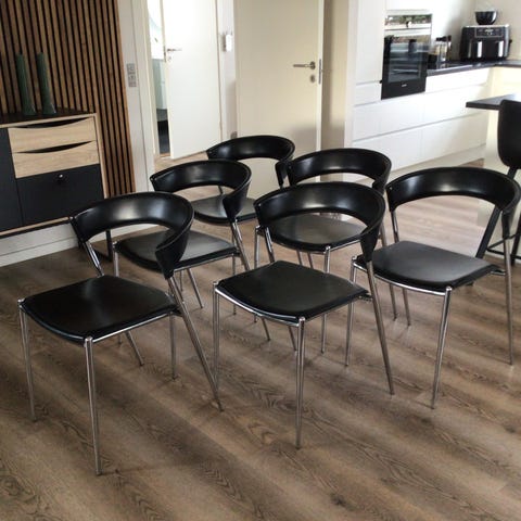 6 stk. Spisebordsstole i ægte læder på dreje sokkel. I cognac farve. Sælges da vi skal flytte.