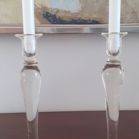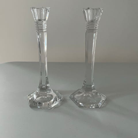 Glaslysestager. 2 ens solide glaslysestager i fint klart glas.