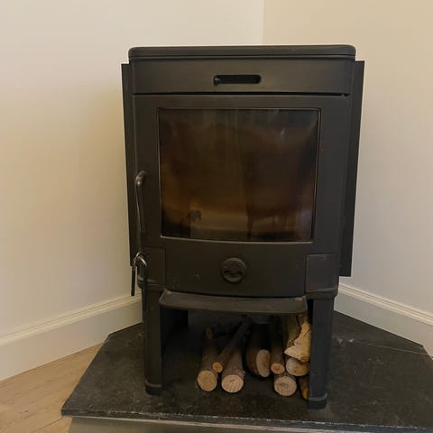 Brændeovn i sort stål med glaslåge på fronten. Fra ca 1990. Udskiftes pga nye regler i Aarhus. Ovnen har håndtag i siden, luftregulering på fronten og askeskuffe nederst. Egnet til opvarmning af rum ved fyring med brænde. Designet til gulvplacering foran skorsten eller røgrørstilkobling. Glaslågen giver udsyn til flammerne under brug.