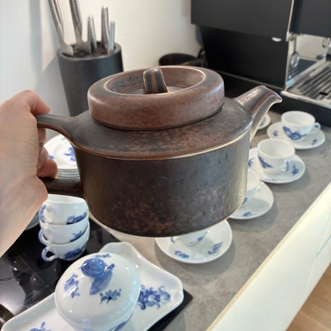 Arabia tekande i brun stentøj. Tekanden har låg med hank og sidehank til hældning samt tud.