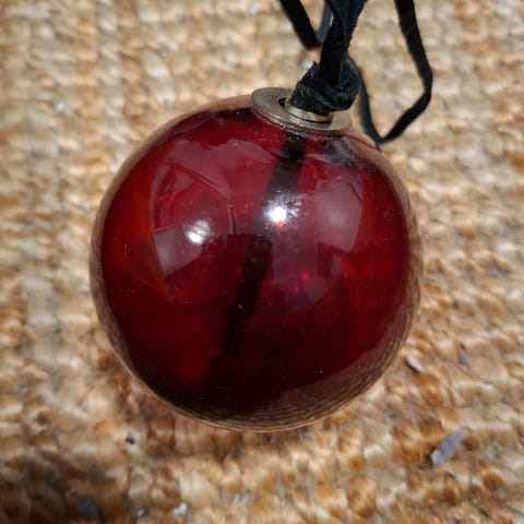 Meget smuk glaskugle med led-lys indeni. Med lang, tynd ledning og lille transformator til at sætte i en stikkontakt. Smuk som ophæng i et vindue el. lgn.