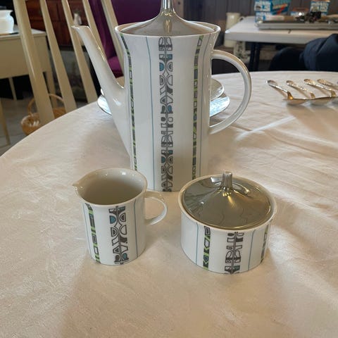 Rosenthal stel porcelæn med blå blomst dekoration. Stellet omfatter tallerkener, kopper med underkopper, kander og små kander, alle i hvidt porcelæn med blå blomstermotiv. Egnet som kaffestel eller spisestel i hjemmet, til daglig brug eller til borddækning ved gæster. Rosenthal-stellet kan kombineres med andet hvidt porcelæn og passer ind i klassiske såvel som mere enkle bordopdækninger.