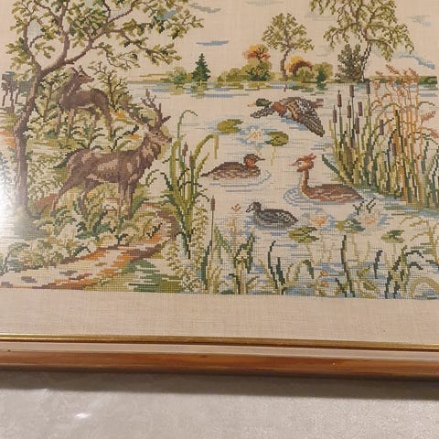 Sæt med to broderede vægbilleder med silhuetmotiv af kvinde og mand i historisk påklædning. Motiverne er udført som korsstingsbroderi i flere farver på lys baggrund. Begge billeder er indrammet i sorte ovale rammer. Bagsiden er beklædt og har ophæng til vægmontering. Velegnet som dekorative vægbilleder i f.eks. stue, soveværelse eller entré.