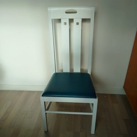Highback ingram stol af Charles Mackintosh i hvidlaseret asketræ og sæde i rødt læder. 151 cm høj. Siddehøjde 41 cm