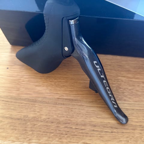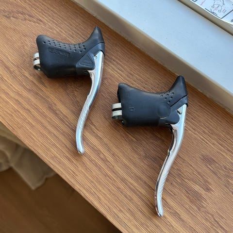 Shimano Ultegra 600 SLR bremsegreb til racercykel i sort/grå. Sættet består af et højre og et venstre bremsegreb med integreret grebskappe i struktureret gummi for bedre greb. Til kabelføring indvendigt i styret. Meget lidt brugt (fremstår tilnærmelsesvis ubrugt).
