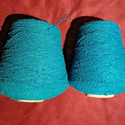 Stor cone , 1,5kg , med blødt boucle garn i changerende blå toner. 100kr og jeg sender gerne på købers regning