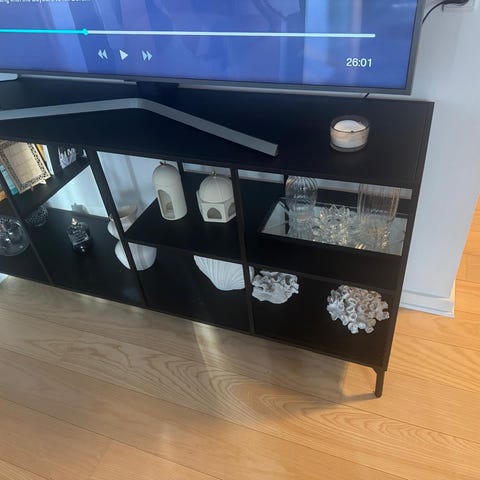 Ilva Asmussen tv-bord i hvidt design. Møblet har en lukket skabsløsning i den ene side og åbne hylder i den anden side, som giver plads til opbevaring af elektronik, bøger eller dekoration. Tv-bordet er lavt og egner sig til placering af tv i stuen eller andre opholdsrum. Benene er enkle og giver et stabilt udtryk.