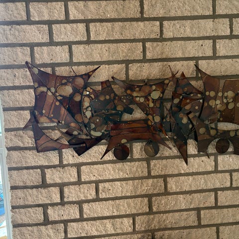 Relief fra 60 erne .....Vægdekoration i metal med geometrisk motiv i brune nuancer. Består af sammensatte cirkler, rektangler og andre former, der danner et abstrakt mønster. Egnet som vægkunst i stue, gang eller kontor, hvor der ønskes et markant og grafisk udtryk.