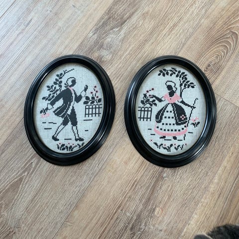 Sæt med to ovale broderi vægbilleder i sorte rammer. Motiverne forestiller en mand og en kvinde i historisk påklædning omgivet af dekorative bladranker. Broderiet er udført i hovedsageligt sort og orange på lys baggrund. Bagsiden er beklædt, og der er ophængsbeslag til montering på væg. Velegnet som vægdekoration i fx stue, gang eller soveværelse.