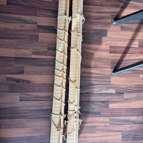 bambus rullegardin i naturfarvet træ/bambus. Rullegardinet består af smalle bambuslameller samlet med snore og leveres med ophængsbeslag og kroge som vist på billederne. Velegnet som solafskærmning eller afskærmning i vinduer eller døre.