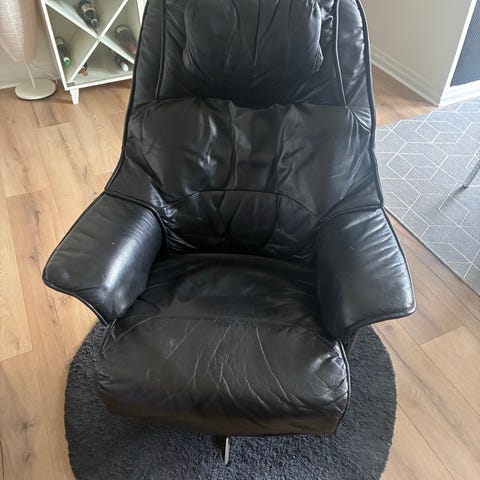 Ilva lænestol med sort læderbetræk og stel i bøgetræ. Stolen har polstret sæde og ryg samt integreret nakkestøtte. Armlæn og ben er udført i formspændt træ, og undersiden har netunderstøttelse for sædet. Egnet som læse- eller hvilestol i stue, kontor eller opholdsrum.