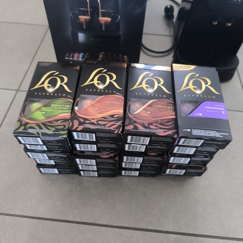 Philips L’OR kapsel kaffemaskine i sort. Maskinen er beregnet til brug med L’OR kaffekapsler, som ses på billederne. Den har to kaffeudløb, aftagelig drypbakke og vandbeholder bagpå. Velegnet til brygning af en eller to kopper kaffe ad gangen med kapselsystem.