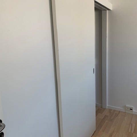 2 Skydedøre til garderobe eller skab i hvid overflade med aluminiumsprofiler. Dørene kører i øvre og nedre skinner. Sælges EX skinner. Egnet til indbygget skab eller garderobeløsning, hvor der ønskes skydedøre i neutral, hvid farve med metalskinner.