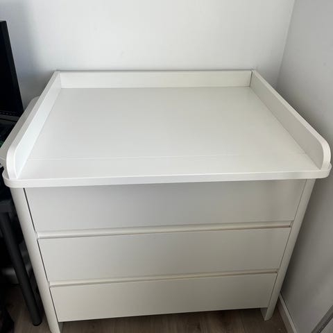 Der er enkelte synlige brugsspor fra en puslepude der har smittet af på toppen i det ene hjørne (kan ikke ses når puslepuden ligger på). Derudover har noget af malingen sluppet på den ene side, da der har siddet nogle børne klistermærker. Den er fast i samlingerne og købt i 2022.