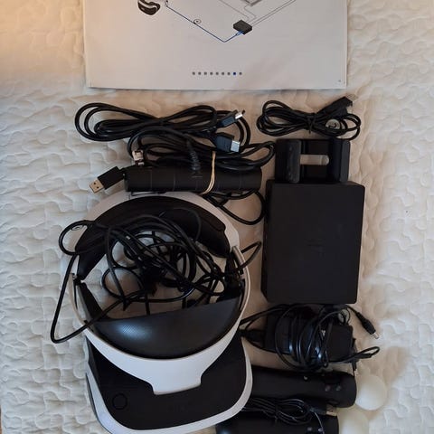 Komplet VR til Playstation 4. Inklusiv kamera, 2 Move controllere, Aim-controller, PS5-adapter, alle kabler - samt VR-spillene Rush of Blood, Demo Disc og det Aim-understøttede Farpoint. Foret i headsettet er let slidt men alt virker perfekt.