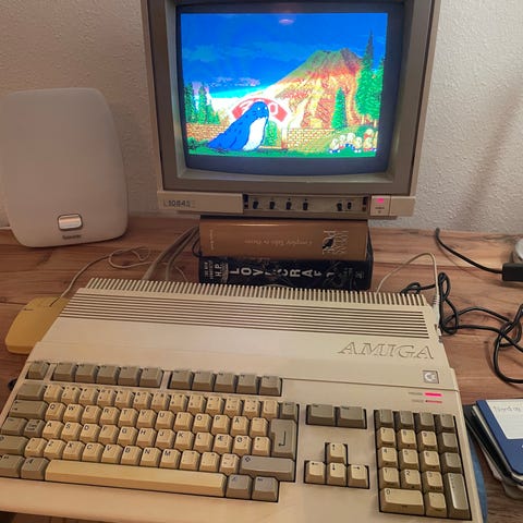 Commodore Amiga A500+ med en del spil, udstyr og HDMI
