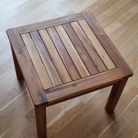 Et tungt og stabilt sofabord, lavet af 3 paller. Har hjul, så det kan nemt flyttes. Er malet med sort træbeskyttelse og har stået på terrasse under tag. Passer perfekt til hjørnesofa. Mål: 111 x 102 x 39 cm. Hentes i Tørslev Hage, 3630 Jægerspris. Der skal være to til at bære.