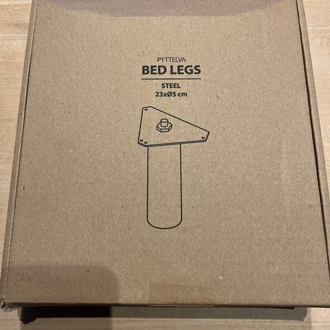 Sættet består af 4 cylindriske ben med tilhørende monteringsplader og skruer. Benene måler 15cm i højden og ø5cm i diameter. De har gevind i toppen til montering i pladerne, som kan skrues fast i sengebund eller ramme.