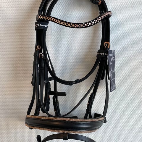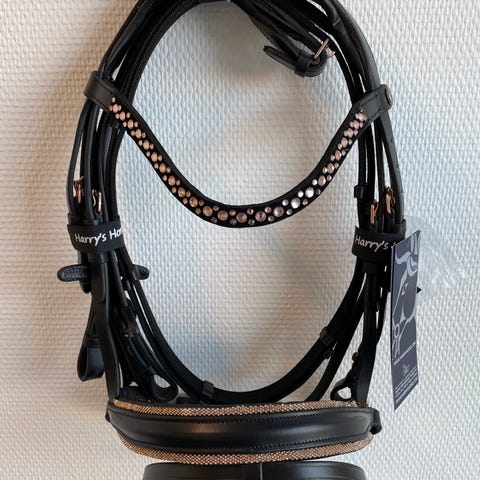 Trensen er sort med rosegold-farvede spænder og sten på pande- og næsebånd.