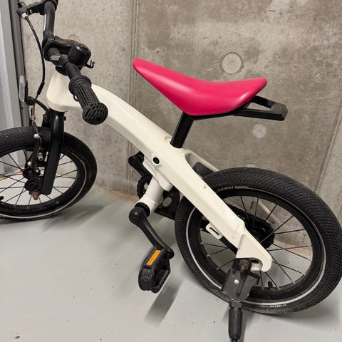 Medfølgende cykelhjelm er en Abus børnecykelhjelm i pink med hjerteprint. Størrelsen er 45-50 cm, vægt ca. 220 g. Hjelmen har justerbart spændesystem i nakken, ventilationshuller samt klikspænde under hagen. Begge dele er egnet til mindre børn, der skal lære at cykle og køre korte ture.