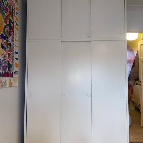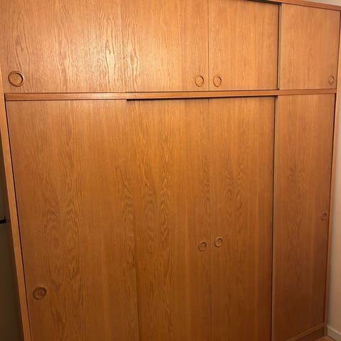 Stort garderobeskab i klassisk 60’er/70’er stil, malet hvidt. Sælges billigt grundet flytning.