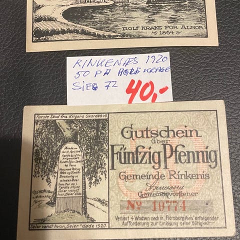 Gutschein Apenrade notpengessedler fra 1920 i pålydende 25 og 50 Pfennig. Sedlerne har motiver med bybilleder, blandt andet våbenskjold med fisk samt udsigter fra Apenrade. Tekst på tysk med angivelse af årstal og værdi på forsiden. Velegnet til samlere af historiske notpengessedler og lokalhistorisk materiale fra Apenrade.