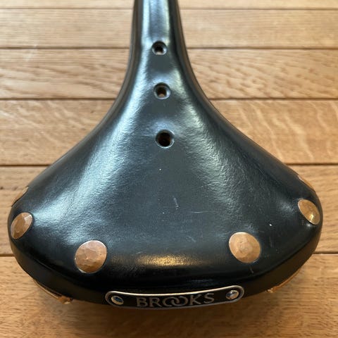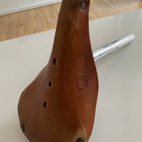 Brooks B15 cykelsadel i brun læder. Klassisk smal lædersadel med nitter og metalskinner til montering på sadelpind. Egnet til brug på citybike, klassisk cykel, racer eller lignende, hvor der ønskes en traditionel lædersadel. Sadlen er ubrugt, men har dog et “skrab” på venstre bag “hjørne” (kan blive fint igen med lidt læder sværte og polering).