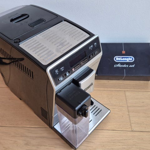 De'Longhi Autentica espressomaskine med cappuccino-funktion. Maskinen er fuldautomatisk og har integreret mælkebeholder til tilberedning af cappuccino og andre mælkebaserede kaffedrikke. Fronten har betjeningsknapper til valg af kaffeindstillinger, og der er aftagelig drypbakke under udløbet. Velegnet til brygning af espresso, sort kaffe og cappuccino i hjemmet eller på mindre kontorer.