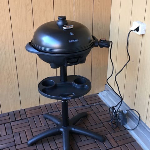 Elektrisk grillspyd med motor til rotisseri. Består af et metalspyd med flere gafler til fastgørelse af kød eller andre emner samt en elektrisk motorenhed med ledning og stik. Spyddet monteres i grill eller lignende og drejes automatisk af motoren for jævn tilberedning. Velegnet til brug i kuglegrill, gasgrill eller anden grill, hvor der er mulighed for montering af rotisseri.
